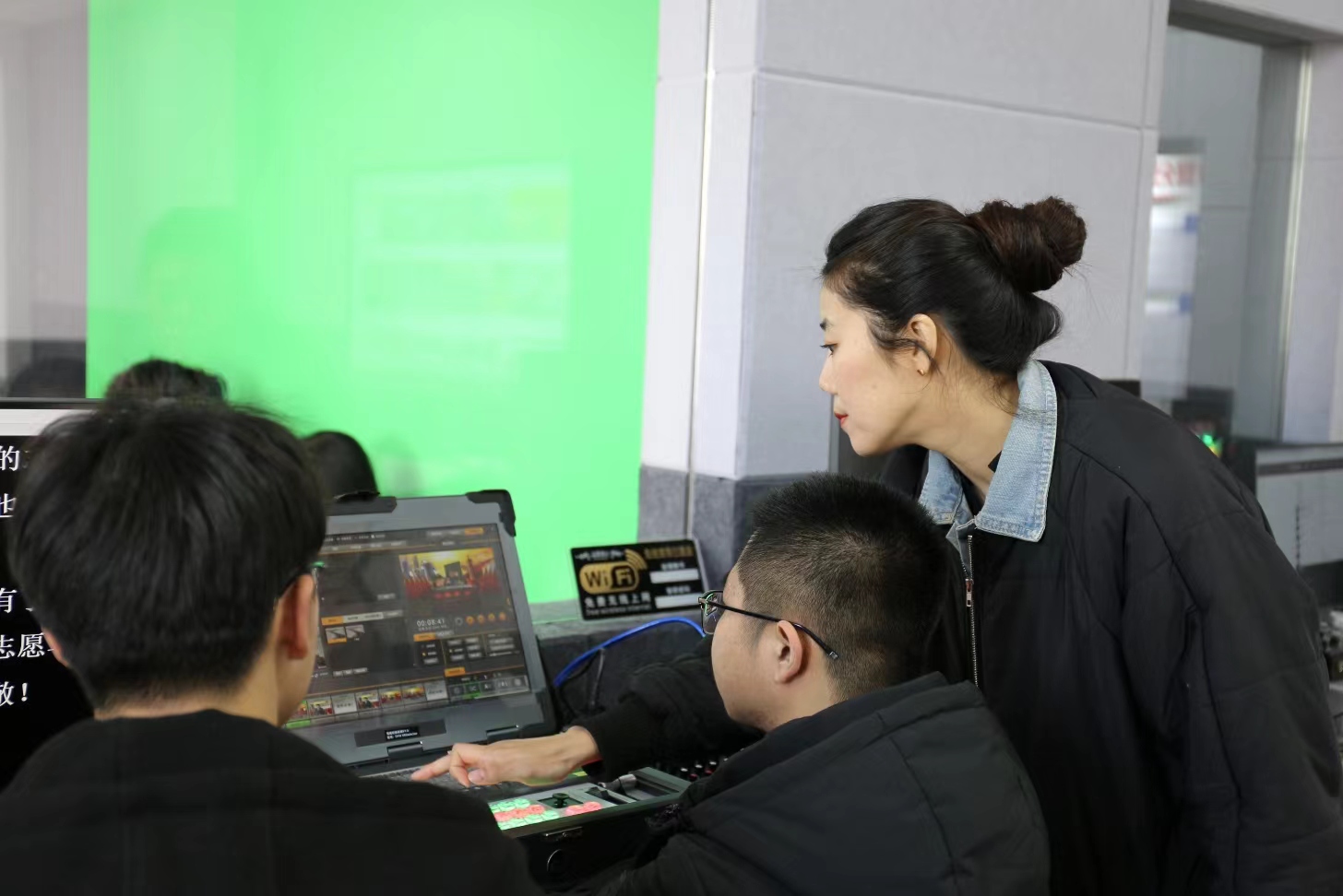 “下载文本文件后,切记不要直接导入,容易出现乱码。”“演播厅的虚拟背景可以切换,但注意字幕版务必与虚拟背景相匹配。”这是正在指导学生参加《辽宁省大学生网络新媒体创新创业大赛》的武擎昊老师。武老师耐心纠正演播厅的同学坐姿,讲授新闻专题播报的注意事项,教导同学们使用大娱号智能切换系统对演播厅虚拟背景进行转场处理。学生们在武老师的培训下,不仅掌握了电视新闻专题片的制作技巧,也在训练当中不断提升团队协作与沟通能力。