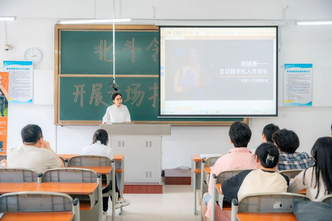 北斗领航国际管理咨询有限公司校招负责人李葳,向与会师生介绍了前途通“数字化人才培养实习就业合作项目”。她指出,数字化技能通用人才培养是各专业皆可参与的全民数字化素养提升工程,是掌握从技能的“人”到“人才”的数字技能练兵场。北斗领航致力于为我系学生提供实习就业相适配的岗位,并详细介绍了实习方向、实习岗位、职位待遇及晋升空间等内容。