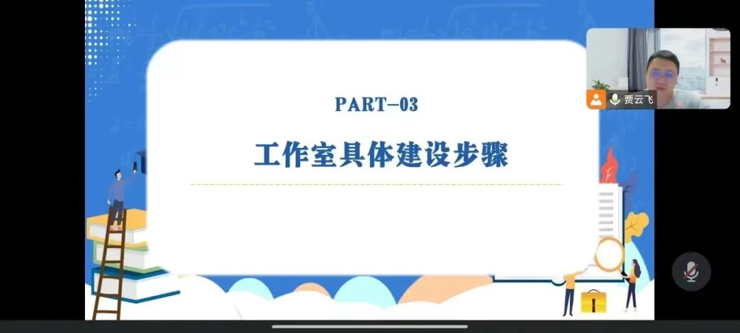 本期“辅导员名师工作室主题沙龙活动”的主题为“如何建设辅导员名师工作室”。本次线上沙龙活动由“云说工作室”主持人、管理与传媒系辅导员贾云飞老师主讲。他分别从“辅导员名师工作室建设的意义、辅导员名师工作室建设目标和方向、辅导员名师工作室具体建设步骤”,三大方面进行详细的交流分享。