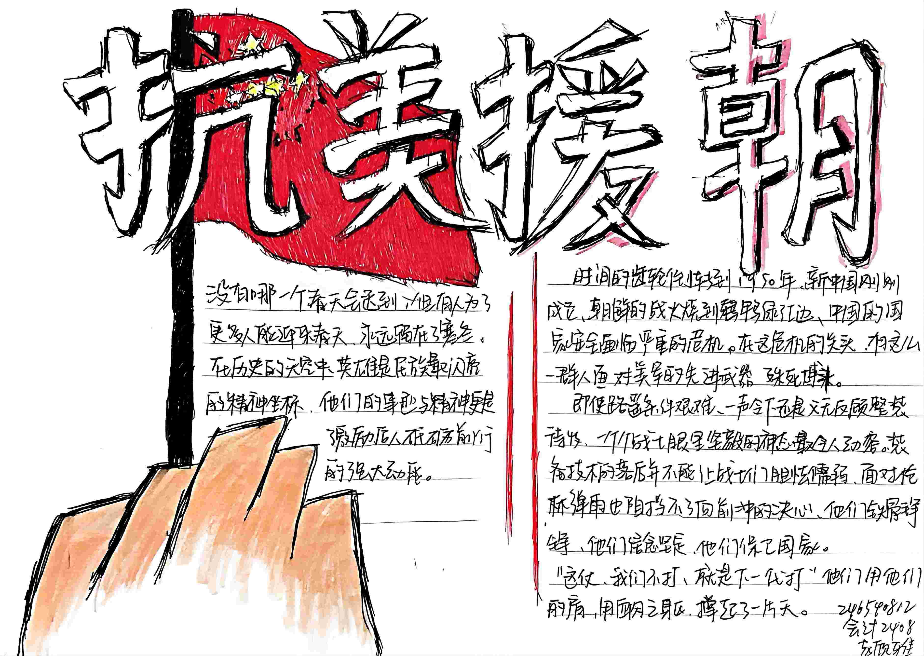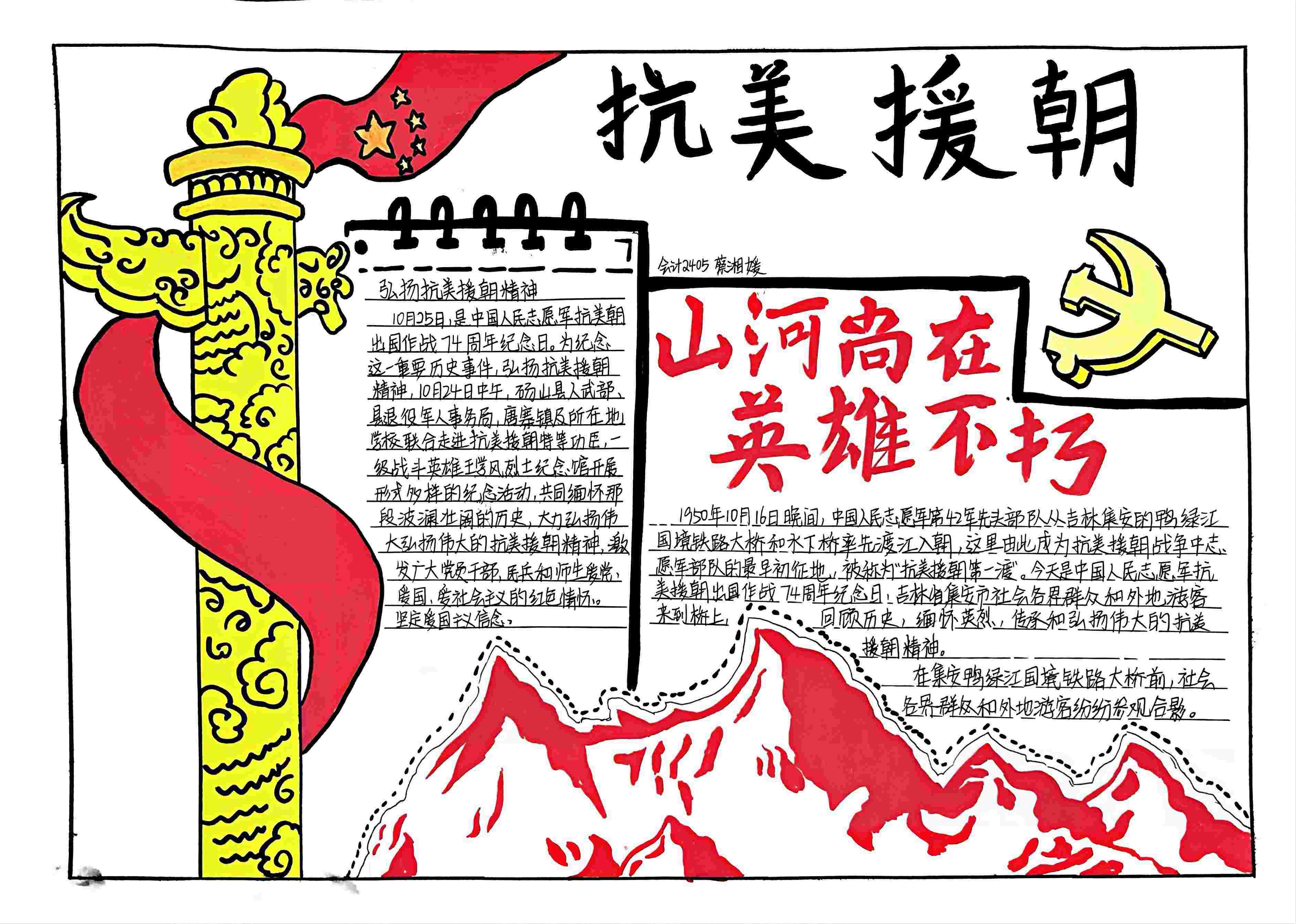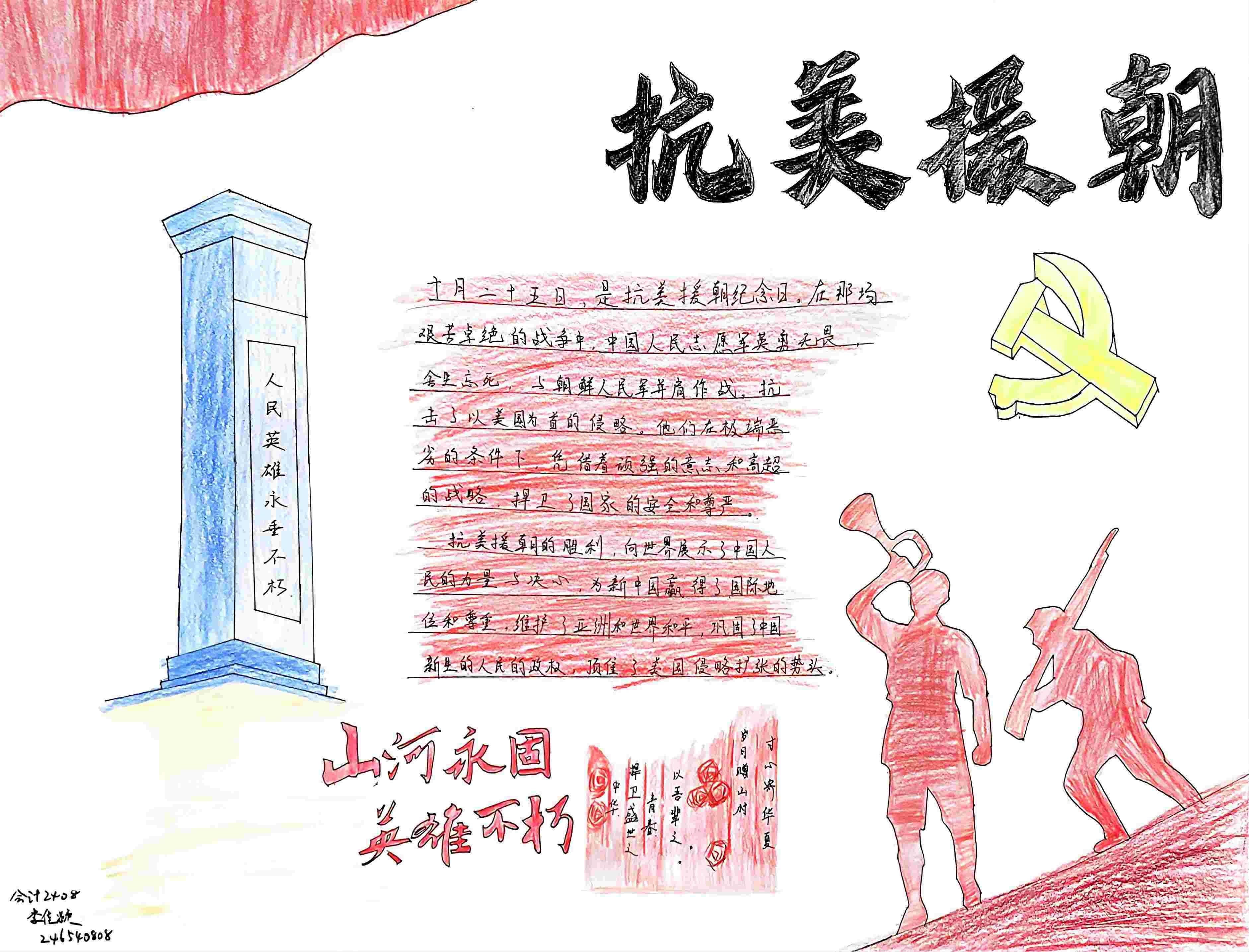 为深化落实《管理与传媒系抗美援朝精神育人的建设方案》,弘扬伟大的抗美援朝精神,引导学生树立崇高的理想信念,厚植爱国主义情怀,管理与传媒系举办“缅怀革命先烈·争做时代新人”抗美援朝主题手抄报线上展演活动。经过一段时间的征集,我们收到了众多优秀的手抄报作品。这些作品充分展现了抗美援朝战争中蕴含的丰富精神内涵和时代价值。接下来,请大家一同参与到投票环节,为你心目中最优秀的手抄报助力!
