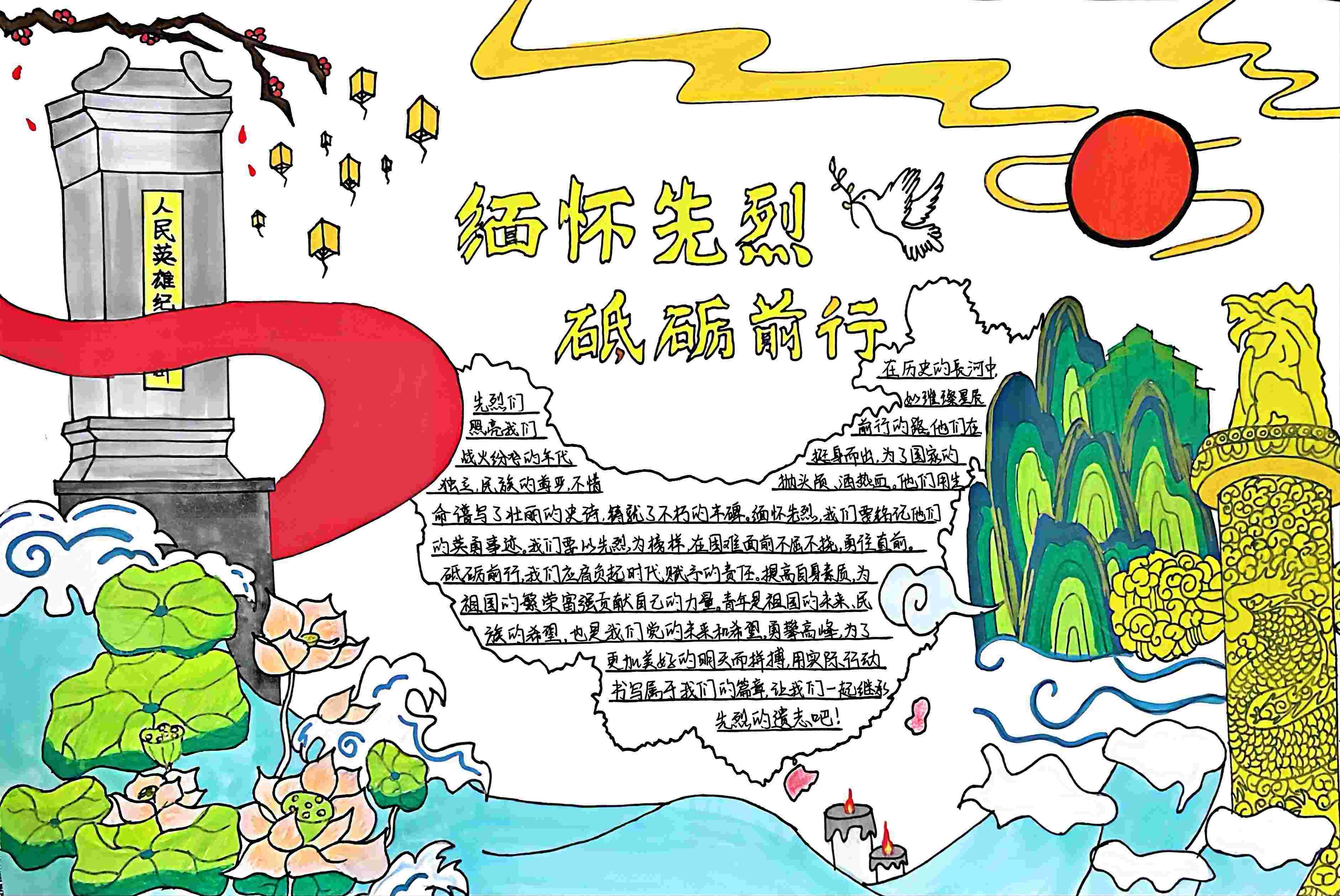 本图画主要由人民英雄纪念碑,孔明灯,和平鸽,中国地图,祥云,红日,群山,荷花,海浪,蜡烛,华表等素材构成,图画展现出对英烈们的崇高敬意,激励我们缅怀历史,砥砺前行。