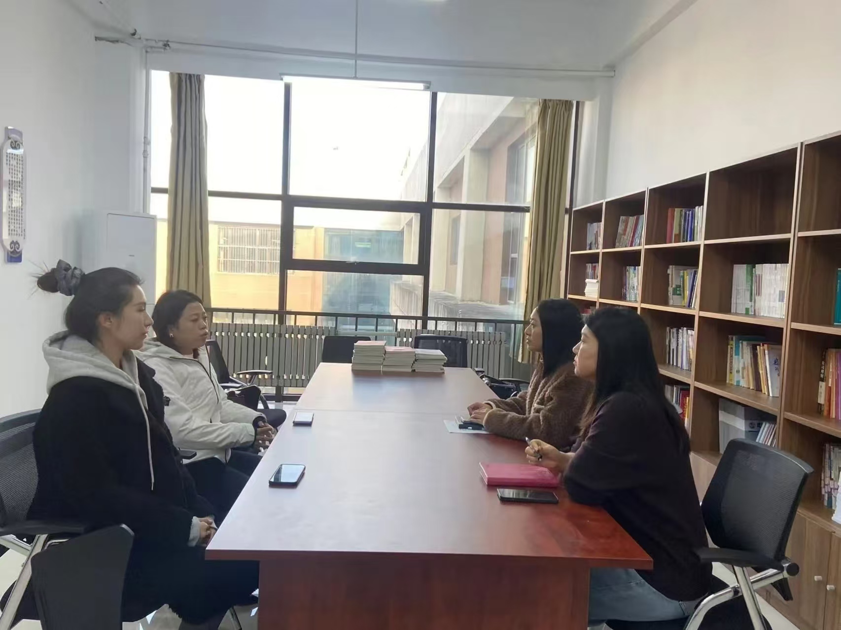 在第一教学楼516室,管理与传媒系主任郑鑫、会计学教研室主任孙硕与杨涵总经理共同出席了座谈交流会。