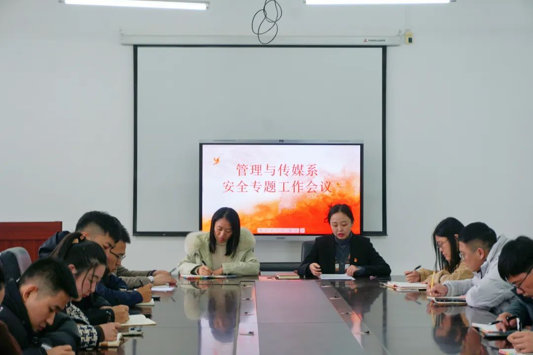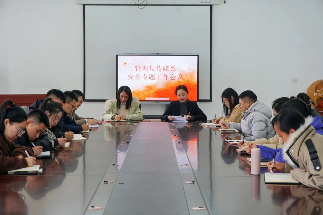 为深入贯彻落实党的二十届三中全会精神及学校党委下发关于安全工作的重要通知及部署安排,切实提升全系师生的安全意识,增强校园安全稳定,11月25日,管理与传媒系于第一教学楼527会议室召开了安全工作专题会议,共同聚焦校园安全问题。管理与传媒系主任郑鑫、副主任贾晨露及各教研室主任和各级辅导员参会,会议由管理与传媒系党总支副书记蒋明儒主持。
