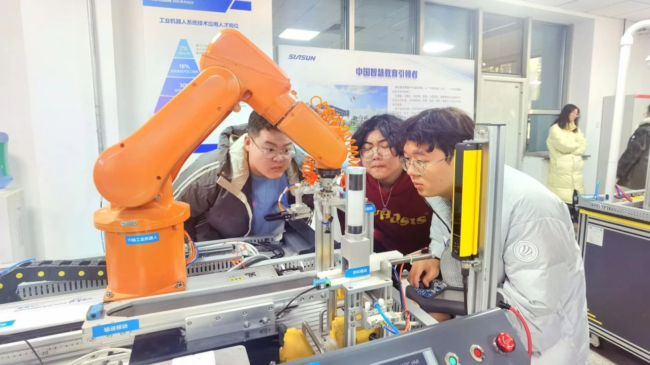 接下来,认知实习进入了实践操作环节。在工作人员的带领下,同学们来到辽宁省智能制造产教融合基地进行实操演练,利用工业机器人实训编程及操作平台学习六轴机械臂机器人的操作。在专业技术人员的指导下,同学们分成若干小组认真学习了机器人的工作原理和操作方法,并进行了六轴机械臂实际操作练习。通过亲手操作机器人,同学们不仅提高了自己的动手能力,还培养了团队合作精神和解决问题的能力。