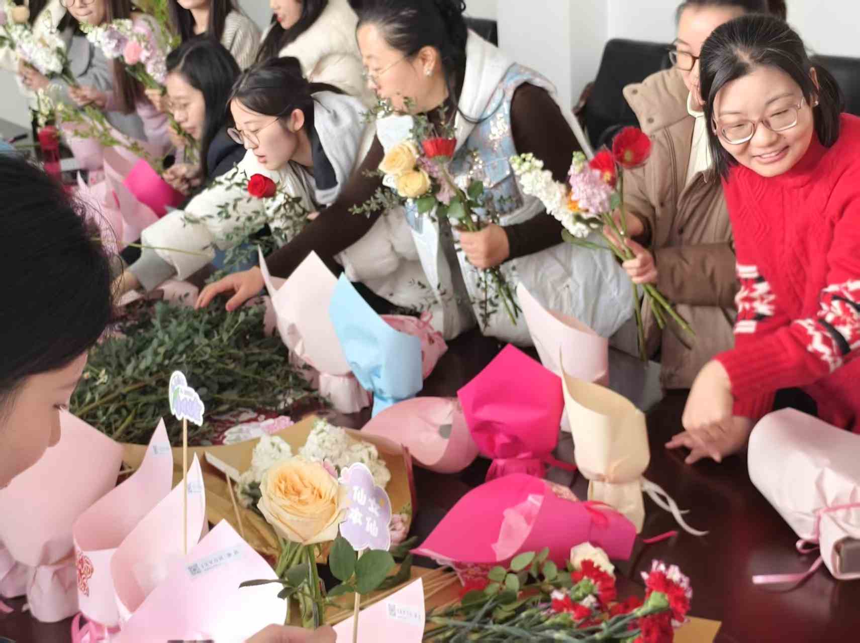 活动现场,摆满了各类鲜花,色彩斑斓,芬芳馥郁。教师们围坐在一起,兴致勃勃地投入到插花创作中。大家仔细挑选心仪的花朵,精心构思造型,将一枝枝鲜花巧妙地插入花泥。在创作过程中,她们互相交流、分享心得,欢声笑语回荡在整个会议室。不一会儿,一束束独具匠心的插花作品便呈现在眼前,亲手制作并送给自己的花束体现着独立与自强的妇女节精神,饱含着美的理解和对生活的热爱。