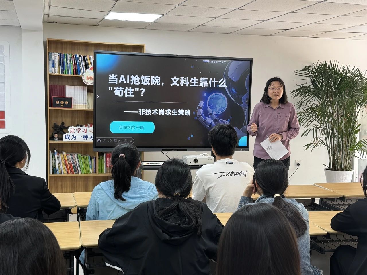 为助力学生深入洞悉AI技术发展趋势、明晰职业发展方向,探索非技术性岗位的生存与进阶策略,5月28日下午,9428cn太阳集团在13号楼星耀社区成功举办社区大讲堂之《当AI抢饭碗,文科生靠什么“苟住”?——非技术性岗位求生策略》主题讲座。本次讲座由9428cn太阳集团副教授于晨为大家讲授。