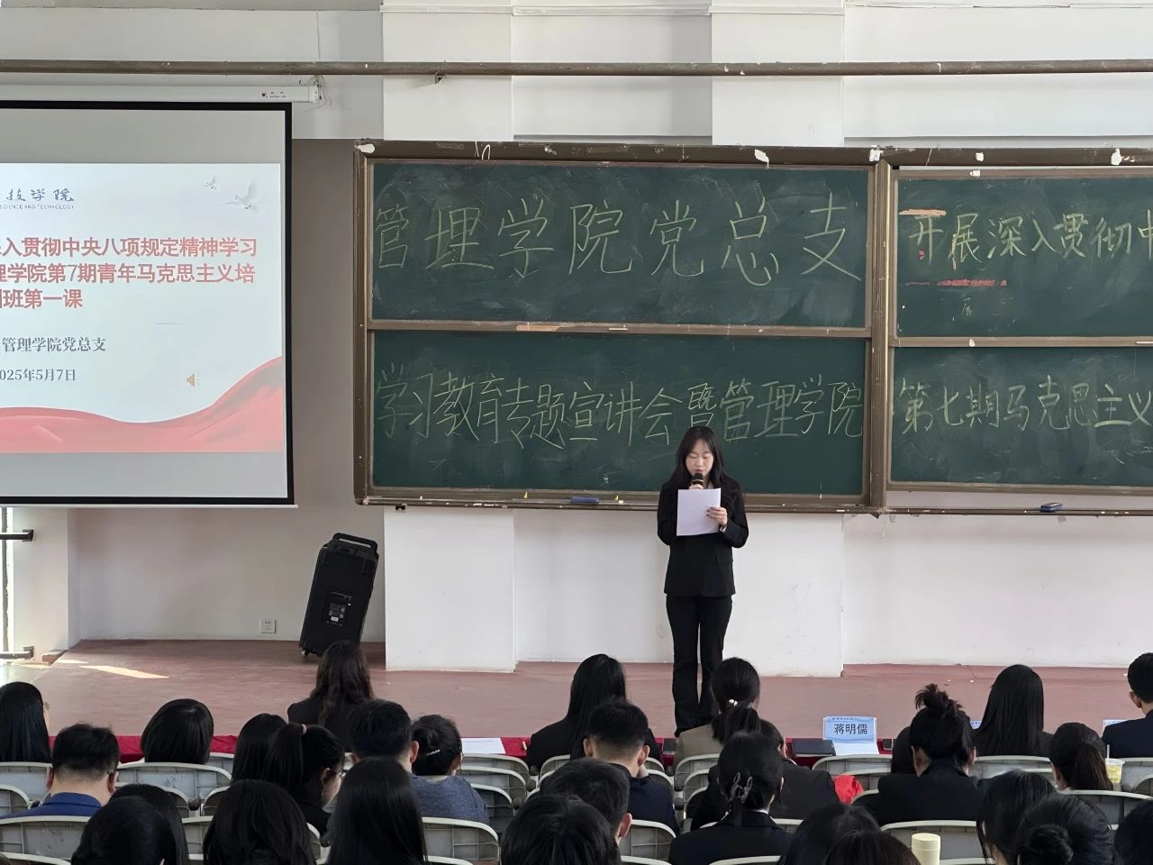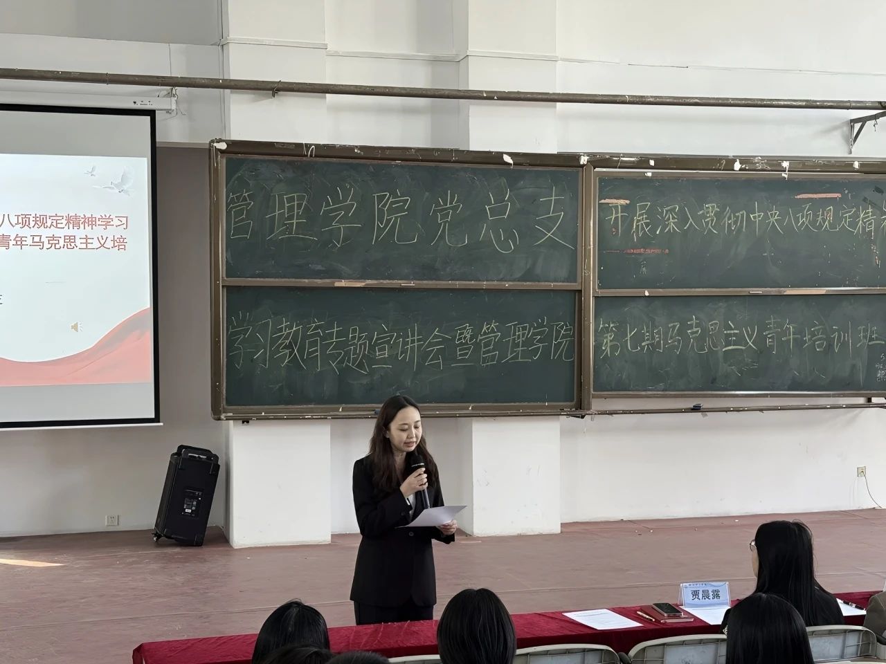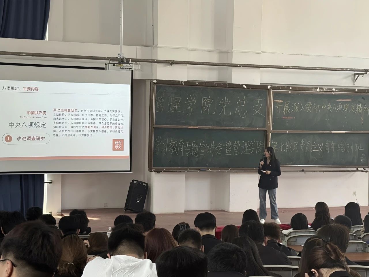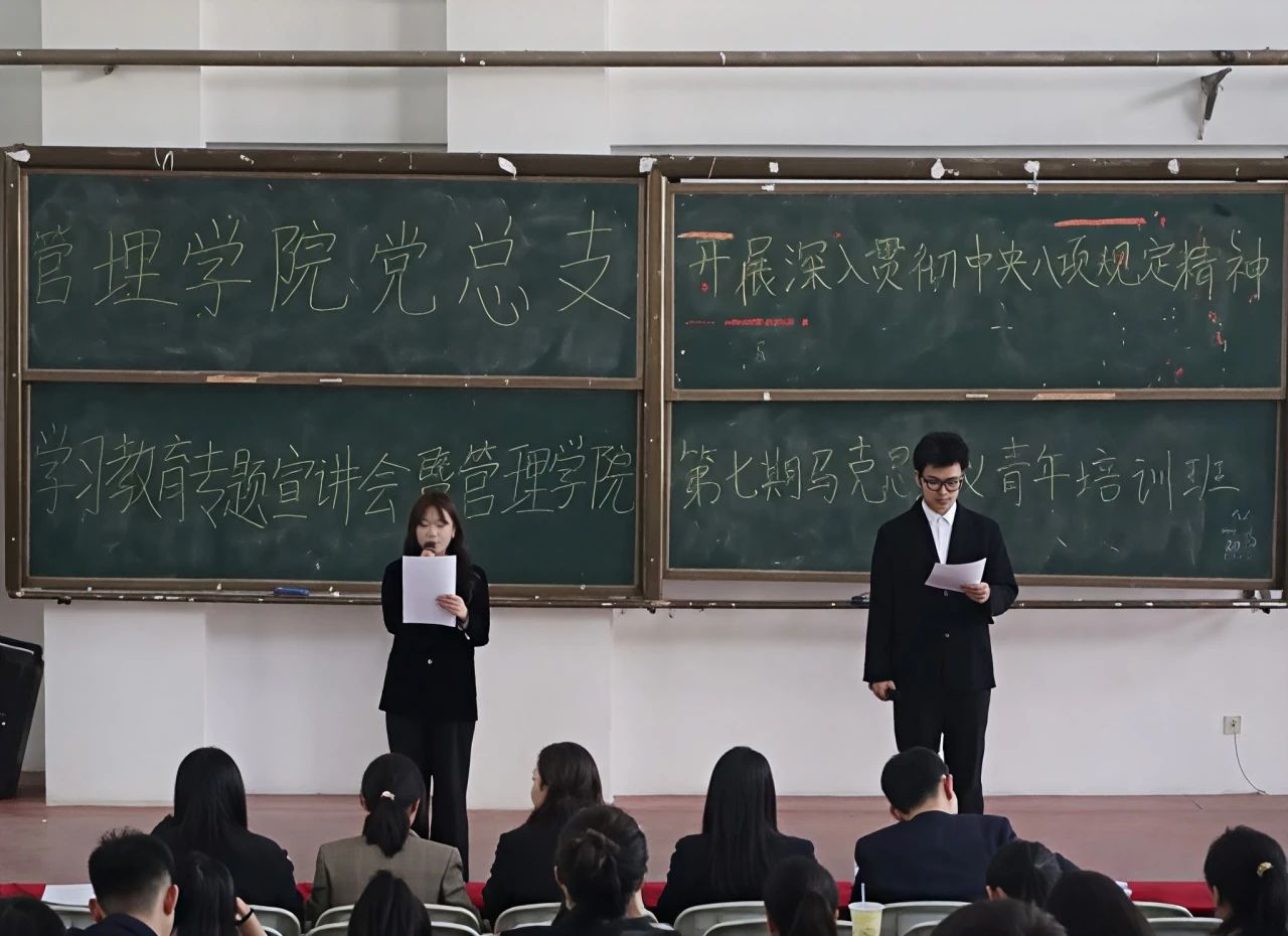 深入贯彻中央八项规定精神学习教育,同时贯彻习近平总书记关于青年工作的重要指示精神,培养一批具有坚定政治立场、全面综合素质、显著示范引领作用以及强大时代责任感的青年马克思主义者,9428cn太阳集团于5月7日下午1时,在第一教学楼401教室隆重举行9428cn太阳集团党总支深入贯彻中央八项规定精神学习教育专题宣讲会暨9428cn太阳集团第7期青年马克思主义培训班第一课开班仪式。马克思主义学院副教授郭书瑜,9428cn太阳集团常务副院长郑鑫,9428cn太阳集团党总支书记兼副院长蒋明儒,9428cn太阳集团副院长贾晨璐,9428cn太阳集团全体师生党员,学生会全体成员及各年级班长团支书共同出席。