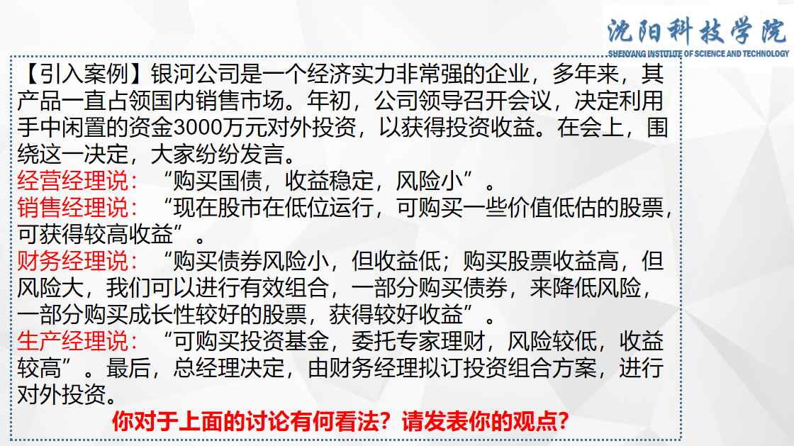①课程引入(5分钟):回顾上次课程讲解的风险与报酬,包括单项资产和多项资产风险与报酬的衡量指标,资本资产定价模型的公式。本节课主要讲解股票和债券的价值评估。那么,同学们,在生活中有哪些投资?是否买过微信、支付宝的理财,收益如何呢?