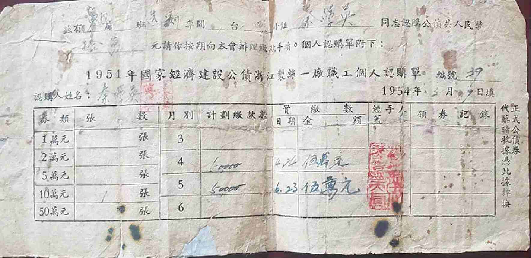 在1954年的国家经济建设公债中,当年公债面额为旧币,与我国现行人民币兑换率为10000:1,即该公债本金为10元人民币,加上相应利息,最多也只有13.2元,经济价值确实不高。但是持有人秦奶奶却不一般,她本人是原浙江制丝一厂职工,早在1956年就被评为省级劳动模范,她的丈夫是抗美援朝的英雄,曾荣立三等功,现在已经过世,子女在收拾丈夫遗物时发现了这张公债。