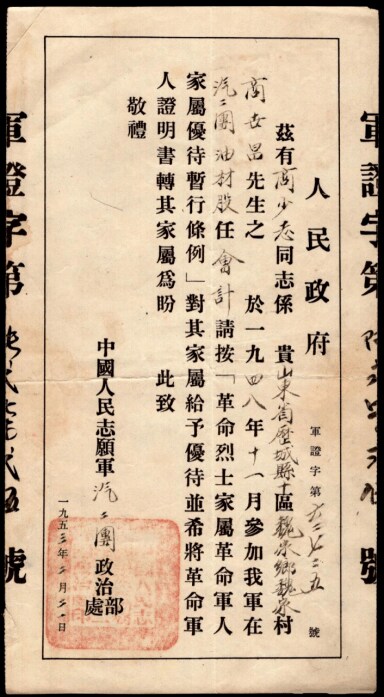 1953年2月21日由中国人民志愿军汽车第二团政治部签发的烈士家属优待证明书,这位名叫商少志的烈士职务是汽二团油材股的会计。抗美援朝后勤运输补给线是一个至关重要的战场,战争初期由于我军没有制空权,防控力量也比较薄弱,美军肆无忌惮地对志愿军补给运输线进行轰炸破坏,导致汽车运输部队战斗减员比例比前线部队还要高。一名普通的汽车运输部队油材会计,为建成“打不断、炸不烂”的钢铁运输线献出宝贵生命。