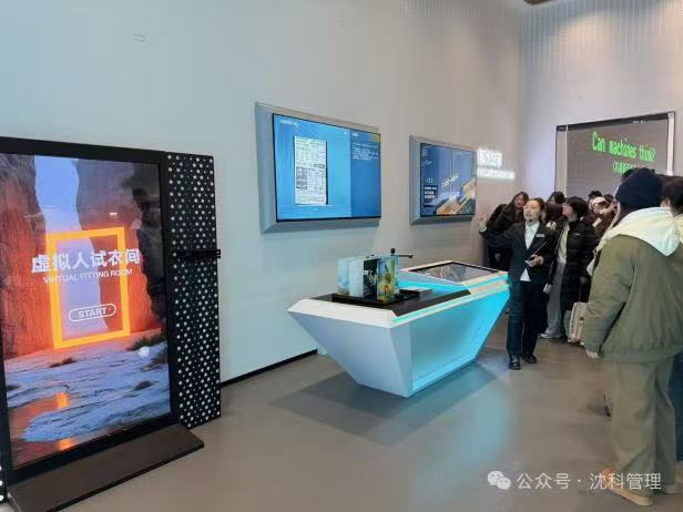 在园区工作人员的引导下,同学们参观了科技展示区,亲身体验了智能机械臂、AI试衣镜、文心大模型交互系统等前沿科技应用。此外,通过华晨宝马智能车间和工业互联网等案例,深入了解了AI如何助力传统产业的转型升级。