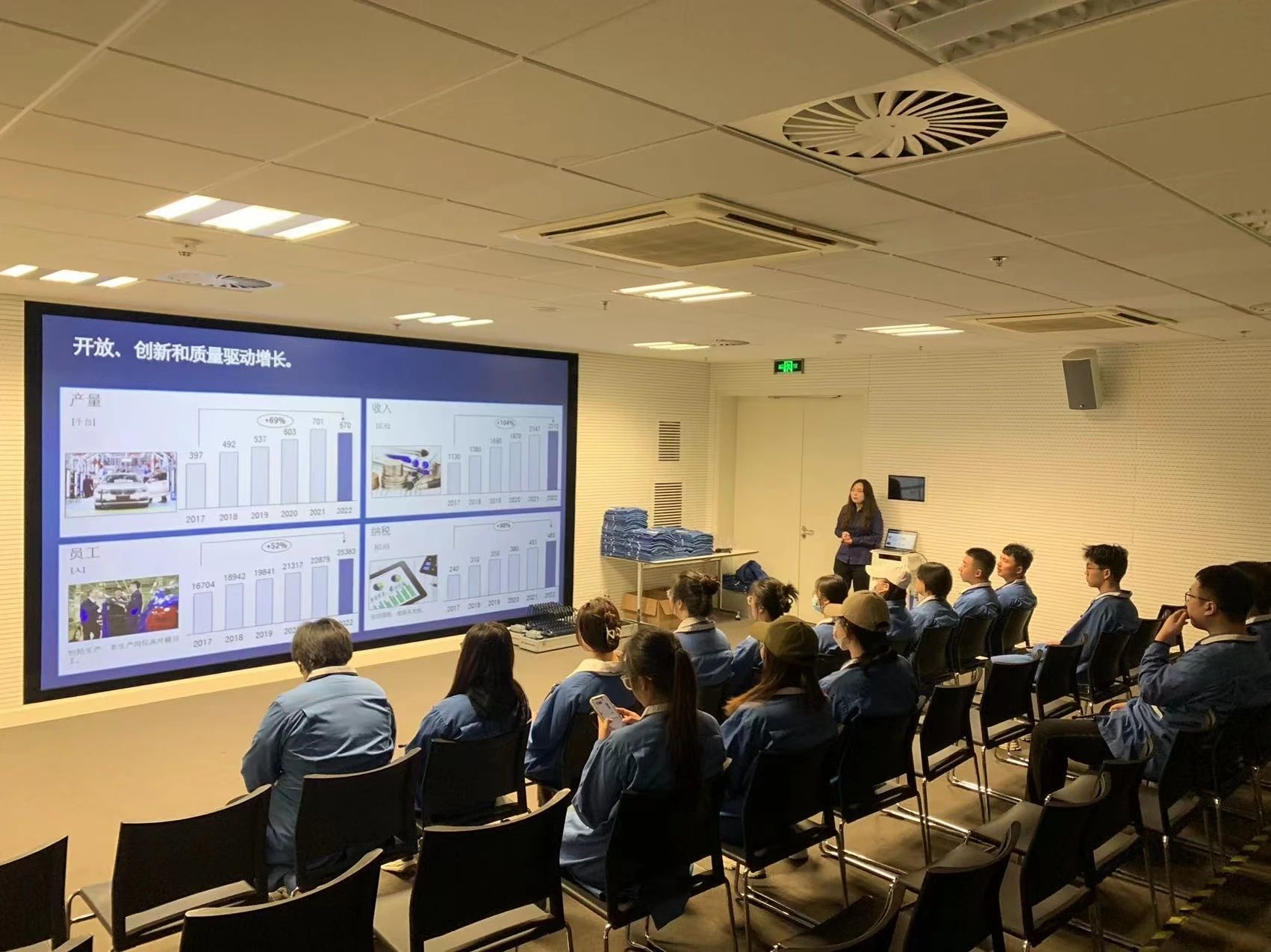 抵达工厂后,在讲解老师的带领下,同学们在办公楼观影区观看视频,初步了解华晨宝马公司的发展历史、工作理念以及企业文化。