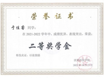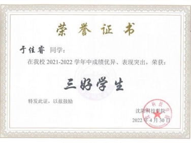 于佳睿同学始终把学习放在自己生活的重要位置,把学习作为第一要务,勤奋好学,态度端正,目标明确,牢固掌握专业知识和技能,真正做到了理论联系实际,专业知识扎实,学习成绩多次位列专业前5名,且在2022-2023学年第二学期位居专业第二名。在校期间获得国家励志奖学金2次、校一等奖学金1次、二等奖学金1次。无论是个人综合能力的培养还是在专业知识技能的储备上,他都能体现当代大学生良好的精神风貌。