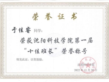 个人获评校三好学生、校优秀学生干部,系优秀班级干部,校第一届十佳班长等多项个人荣誉称号;带领班级获得校优秀班级、校优良学风班级、校五四红旗团支部等多项集体荣誉称号。