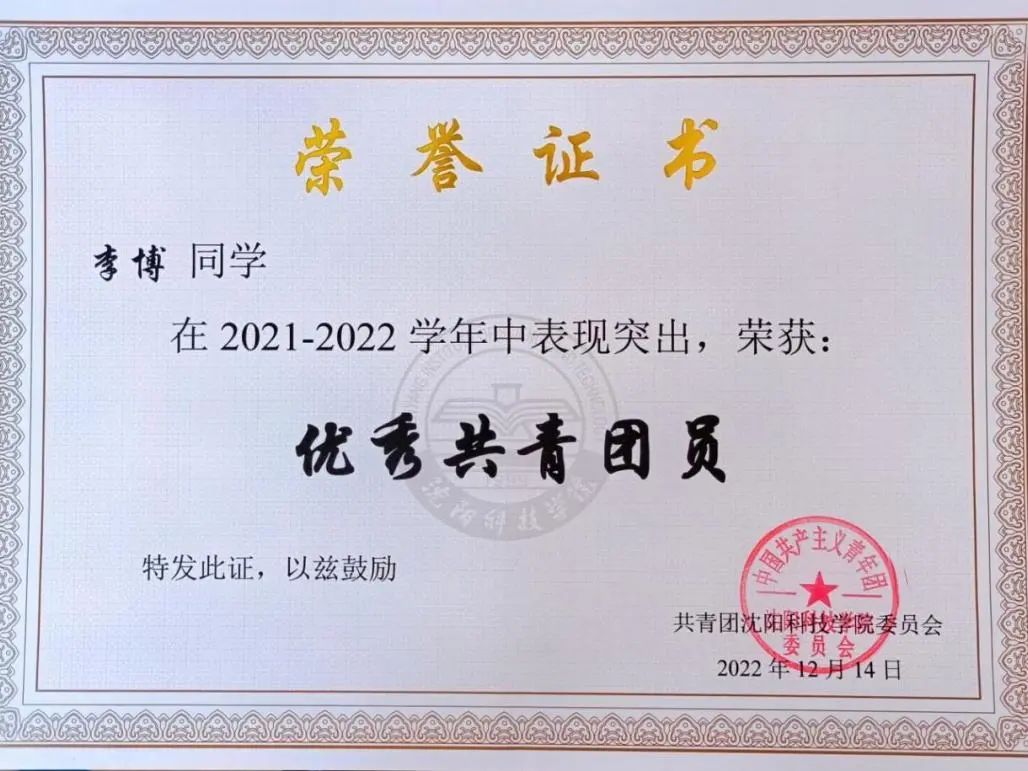 李博同学时刻要求自己,坚定理想信念,坚决拥护中国共产党的领导。李博同学自开学伊始就向党组织递交了入党申请书,定期向党组织汇报思想,于2023年12月成为了一名光荣的中共党员,时刻以严格标准要求自己,发挥模范先锋带头作用。