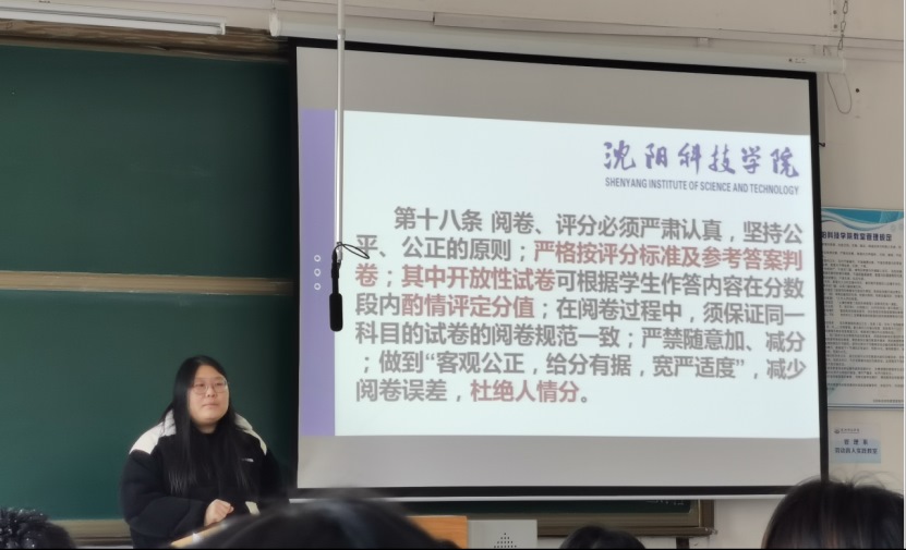 随后,贾老师解读了《试卷评阅要求及规范》,对本学期阅卷工作提出了具体要求。内容包括阅卷教师应严格按评分标准及参考答案判卷,做到客观公正,给分有据,宽严适度,杜绝人情分,流水阅卷,阅卷应统一笔迹标识,应尽量减少错判后修改,避免误判的情况。