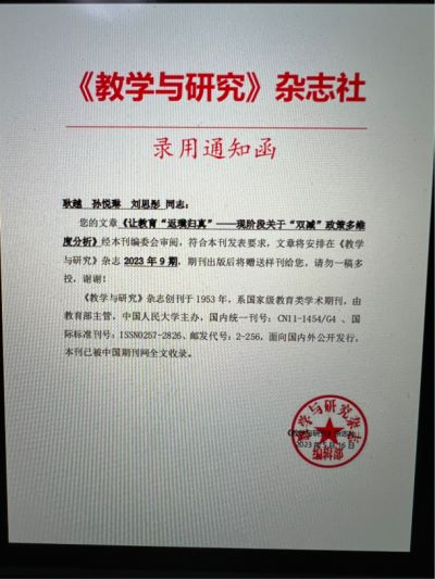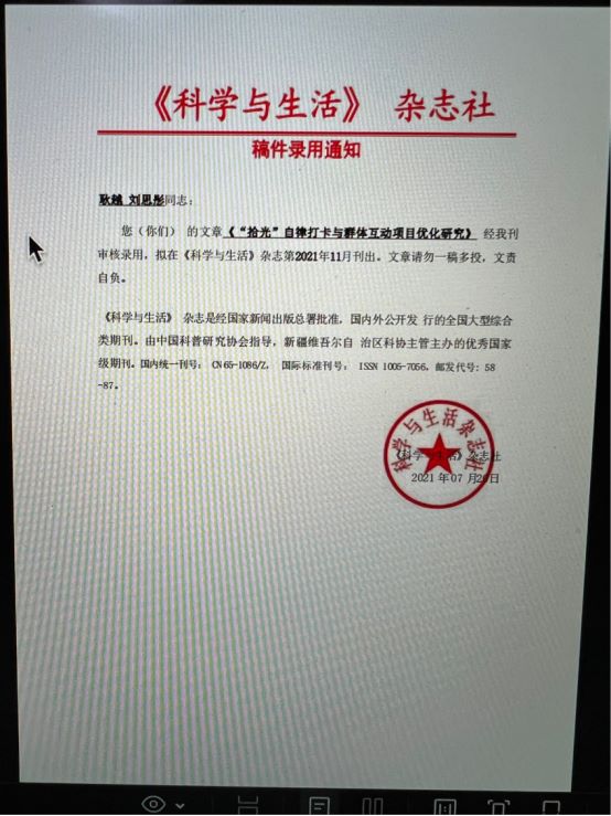 在系部副教授耿越导师的带领下,主持一项省级创新创业项目,三项校级创新创业项目。并且以第二作者发表学术文章三篇,论文“知音难觅”女性健康项目建设问题及对策分析在《中国教工》杂志发表,论文“拾光”自律打卡与群体互动项目优化研究在《科学与生活》杂志发表,获得软件著作权专利 基于自律打卡与群体互动功能app,获得实用新型专利:一种经济管理学教学用演示装置。