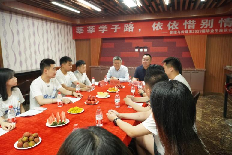明朝即长路,惜取此时心,岁月流转,又是一年毕业季。为进一步做好毕业生关怀工作,强化校、系、生之间的情感纽带, 6月14日下午,党委书记耿乃国前往星月社区活动室和管理与传媒系2023届毕业生代表进行座谈。系党总支书记、副主任赵恩,2019级辅导员张威、李倩以及2023届优秀毕业生代表共计20余人参加本次座谈会。