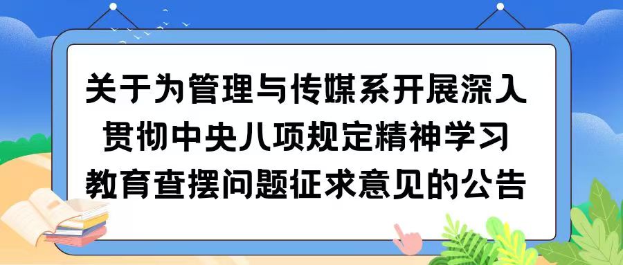 为深入贯彻中央八项规定精神学习教育查摆问题工作,将在学习教育开展期间,面向全系党员、干部、群众征集管理与传媒系领导班子及党员、干部在落实中央八项规定及其实施细则精神方面存在的问题和意见建议。一、征集范围 改进调查研究、精简会议活动、精简文件简报、规范出访活动、改进新闻报道、规范用车用房、厉行勤俭节约、整治形式主义为基层减负、加强督促检......