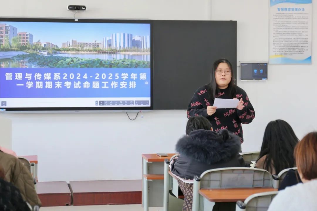 为贯彻落实学校考试管理规定,提高考试命题质量,更好地发挥考试的诊断与评价功能。10 月 23 日,管理与传媒系组织召开2024-2025 学年第一学期期末考试命题工作安排会议。会议由管理与传媒系副主任贾晨露主持。