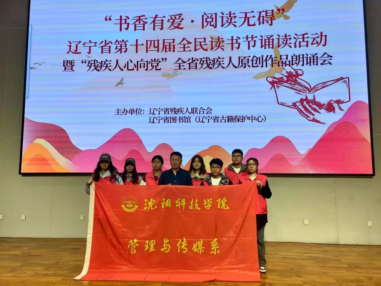 4月19日上午,管理与传媒系组织志愿者走进辽宁省图书馆,参与辽宁省第十四届全民读书节诵读活动暨“残疾人心向党”全省残疾人原创作品朗诵会。志愿者们以实际行动传递爱心,助力营造“书香有爱·阅读无碍”的温暖氛围 。