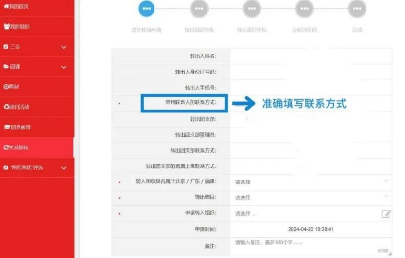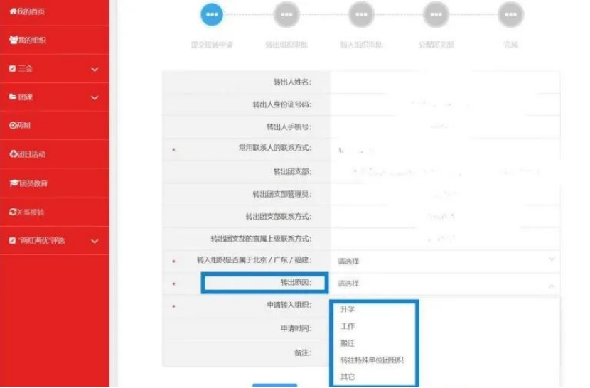 ⑥“转入组织”需要准确填写转入组织的名称(需要团员们填写具体的团支部名称)。