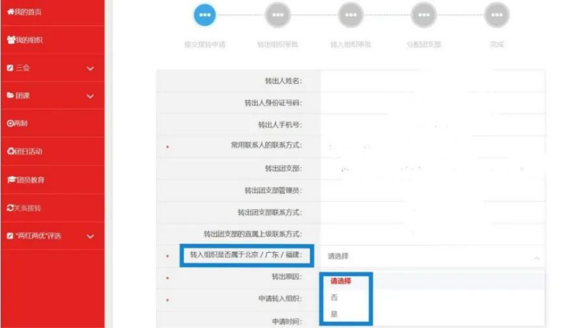 ④“转入组织是否属于北京/广东/福建”中,若转入组织是以上三个地区的其中一个,则选择“是”,若不是则选择“否”。