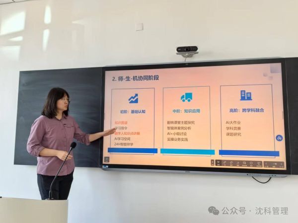 于晨老师则聚焦智慧课程建设的设计思路与教学实践,系统阐述了AI技术在会计教学中的落地路径。她指出,AI不仅能提供个性化学习支持、实时互动答疑、智能备课与作业批改,还能通过数据分析实现精准教学,显著提升课堂效率。于晨老师特别介绍了“师生机协同”三阶教学模式:初阶注重知识图谱与智能伴学等课程模块开发,中阶强调翻转课堂与实操训练,高阶推动跨学科融合与创新实践。她还分享了课前导学、课中弹幕互动、课后智能批改等具体应用场景,为在座教师提供了可借鉴的智慧课堂建设范例。